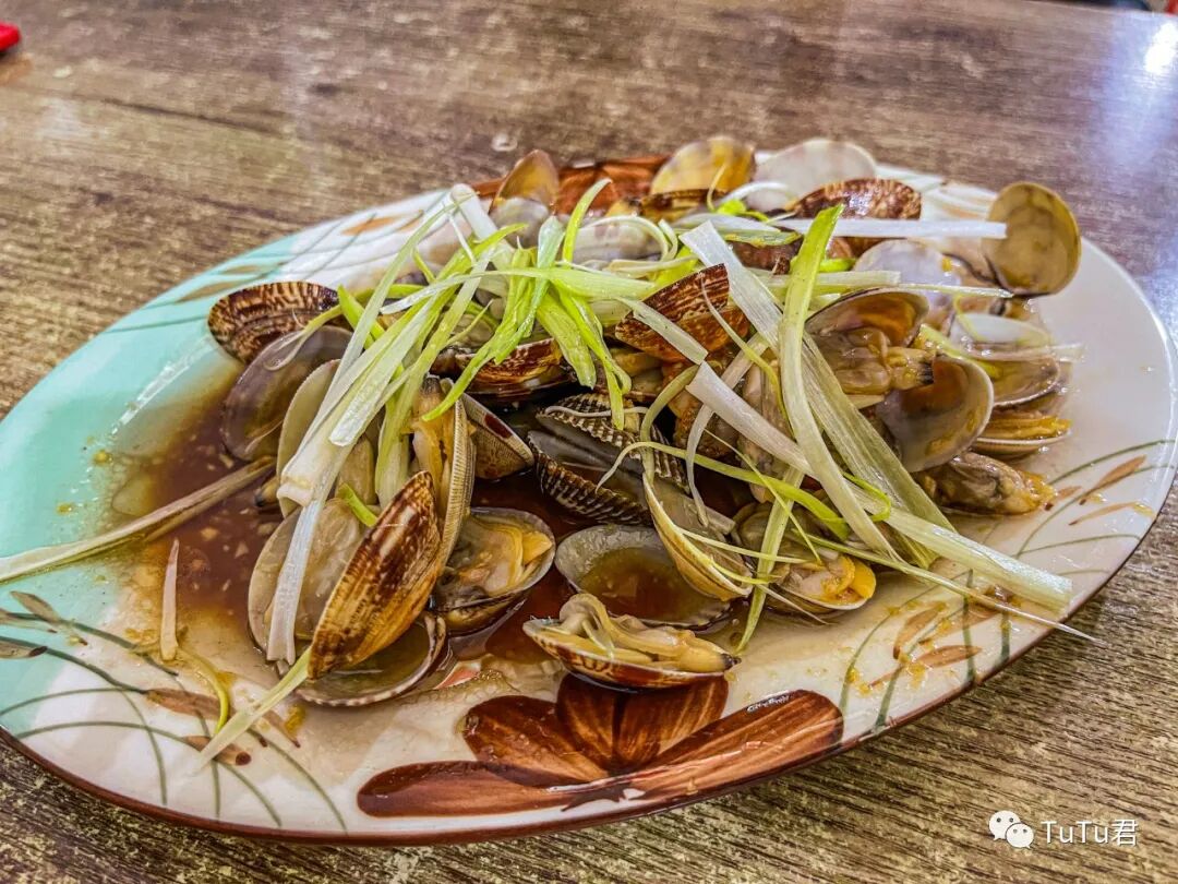【葱油花蛤】刚出锅的花蛤撒上葱丝和蒜末,香气扑鼻,花蛤挺大的,咸香适中,没有沙子,属于饭店里的标准水平。(22元一份,水平在线,不踩雷!)