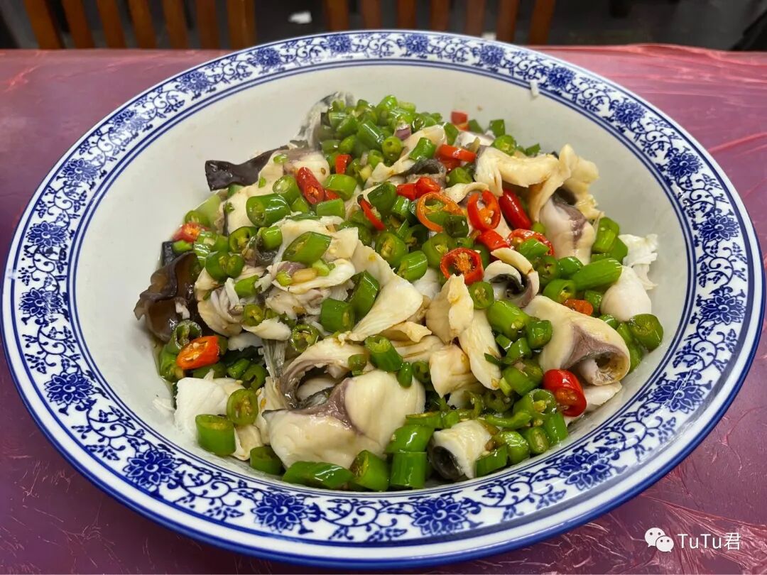 菜品:【过水鱼】超级大的一盆鱼!看上去有很多辣椒,其实并不辣,鱼肉量很多,口感新鲜,肉质紧实。(但是鱼刺特别多,而且都是小刺,相比于其他重口味的菜,这道菜口感略显清淡,58元一份,这个性价比秒杀很多品牌餐馆了)