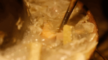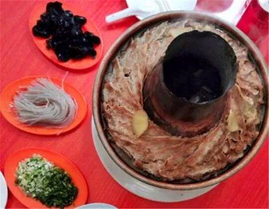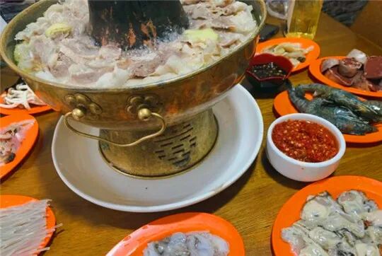老式炭火铜锅,一层干海品,一层酸菜、冻豆腐,一层白切五花肉,就是一个咕嘟,咕嘟时间越长各种食材的味道越能激发出来,酸爽鲜甜的味道。蘸上调料酱,爽~