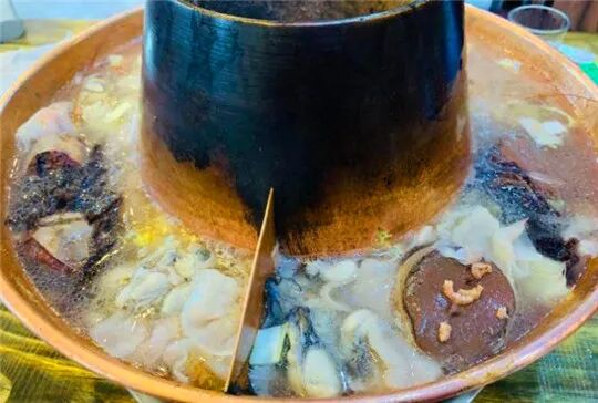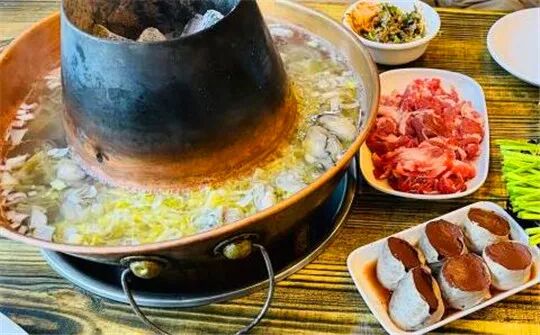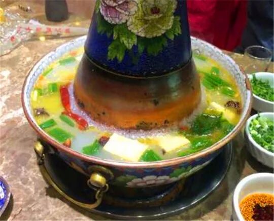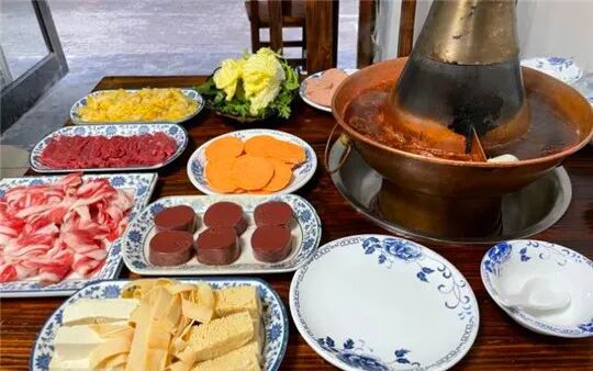 地方但是不大,六七张桌子,人气还是蛮高的,做酸菜铜火锅。铜火锅都是老式的,清汤汤底海米提鲜。