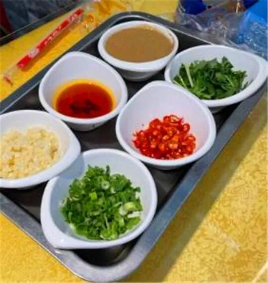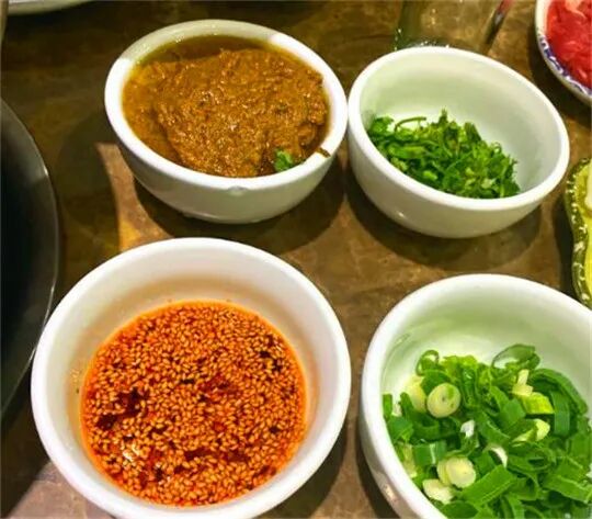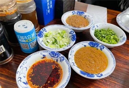 一份芝麻酱,一份辣椒油,葱花香菜,蘸料就齐活了!放上芝麻酱,就是要这种熟悉的味道。