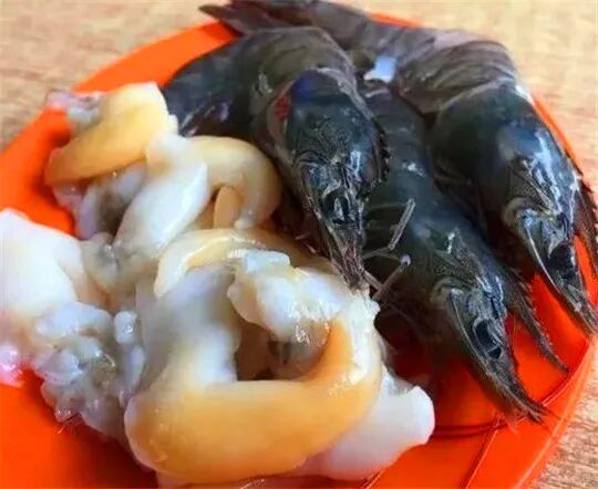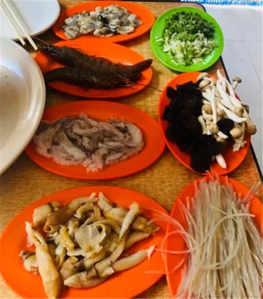 锅底上面一层白切的猪五花,下面是酸菜、冻豆腐。套餐搭配的基本都是以海鲜为主,有鲜虾、鸟贝、海蛎子、蛏子、螃蟹、蚬子、海肠、扇贝!
