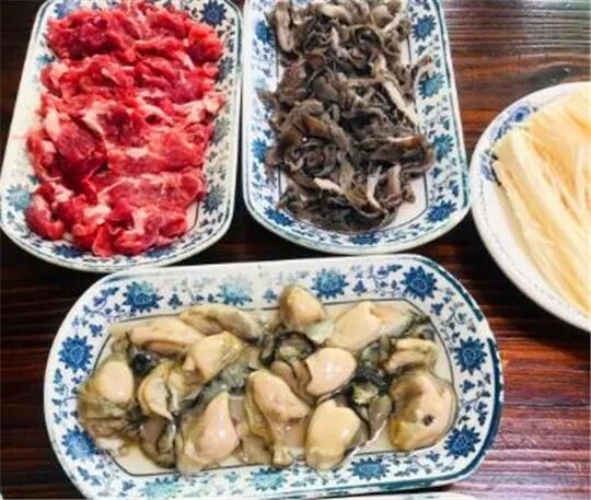 倒入酸菜、五花肉、海蛎子,咕嘟上。羊肉、牛肉都是鲜切的,口感更好。冻豆腐、大豆腐、蔬菜、豆腐皮、都来一些。血肠也是它家必点,自己灌制的,直接吃都很香。