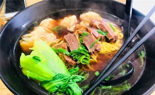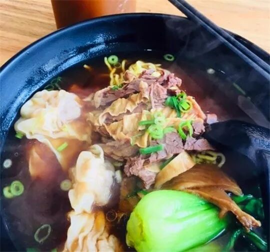 招牌牛腩是有点改良,有清汤和咖喱的可以选。牛腩是正经牛腩,火候不错,软烂同时有嚼劲儿,汤头鲜美,加点现磨黑胡椒更好喝。手打牛肉丸棒棒哒,店里竟然还有红醋,很少见。招牌牛腩云吞面四个云吞,大块牛腩肉,汤牛肉味很浓,偏咸一点,云吞里面是猪肉馅和一整只虾仁。还有咖喱牛腩面和咖喱牛腩饭,牛腩大块、土豆,咖喱汁浓郁很下饭。