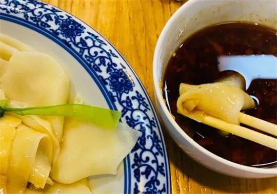 蒜蘸面片,一碗面片、一碗蘸汁儿,分开端上来,吃的时候一片片蘸着吃。最喜欢这种油香汁浓的蘸汁,蒜汁醇厚,辛辣十足。稍微把面条在里面蘸一蘸,就裹上了满满一层汁子,吃起来很满足。