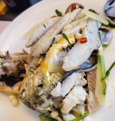 人气最高的午间套餐,当属高汤黄花鱼定食:鱼肉鲜嫩,高汤醇香,搭配得各种小菜。鱼不小,大刺已经处理干净了,鱼本身看起来还是很完整。
