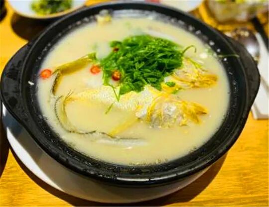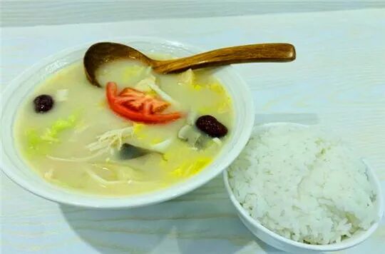 汤底奶白色,没有过多调味,味道鲜美香醇,鱼肉细嫩,配白饭,很清爽,不油腻,好喝。
