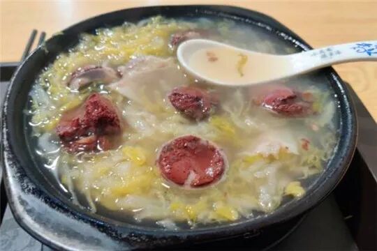 酸菜汤,酸菜的酸酸味道,吃起来脆脆的,而且吸收了肉的香味,里面还有血肠,血肠蘸上蒜酱,味道特别香。
