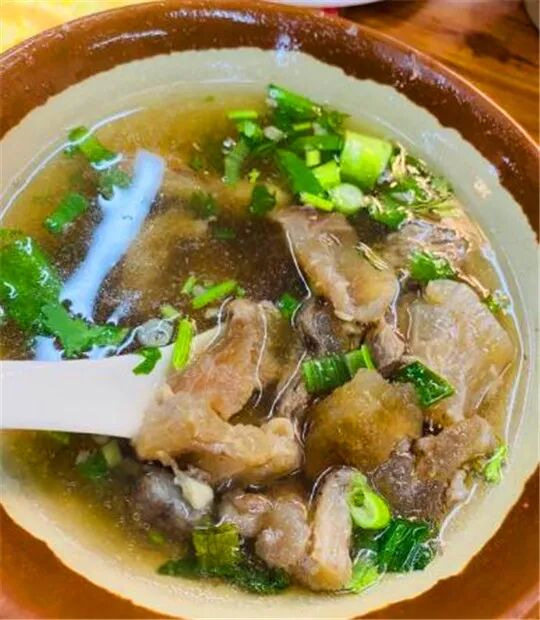 牛筋汤是这里的主打,简单吃就是一碗汤+一个烤饼。汤头清透,里面料也不少,汤里的牛筋是精髓,炖的非常软烂,给的牛筋也不少,可以免费添汤。味道全都进去了,让人有种大块朵颐的冲动。新烤的饼很喧软,搭配正好。