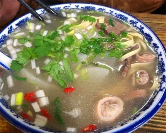 牛肉汤量很大,牛肉几片,以豆腐皮、粉丝等为原料,配上牛肉汤、辣椒油、葱、香菜,汤不够可以免费加。