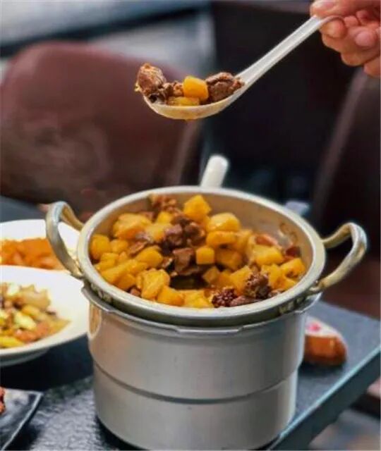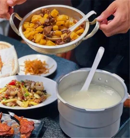 鸽子粥也是它家的招牌之一,连锅带盆的端上桌,上面盆里里是土豆鸽子,下面锅里是香稠的白米粥。