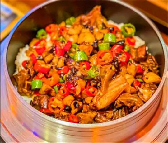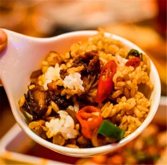 湘味鸽子饭,粒粒饱满的白米饭,铺上满满的小炒鸽子肉,现煲出脆香的锅巴,食用时将米饭和乳鸽肉拌匀,每一粒米饭都吸收了老鸽汤的精华,丝丝入味,甘香诱人!