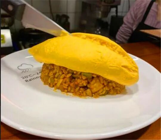 可以点传统日式蛋包饭,刚出炉带有黄金色泽的蛋包饭,用刀子温柔地划开蛋包表层,里面娇嫩的蛋液立马倾泻而出。半熟的滑蛋和米粒质地均匀的混合在一起,再以番茄酱汁调味和点缀。这般给米饭披上一件华丽外衣,既美味饱足又点亮心情。