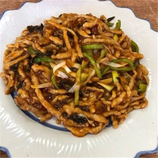 鱼香肉丝,酸口、咸口略微突出一些,略微配了点尖椒丝、木耳丝,肉丝量很足,典型大连版鱼香肉丝,据老板娘说,光这鱼香肉丝,她家不算盖饭最多一天就卖过50盘,小酸,小甜,小辣。肉丝滑嫩下饭神菜。
