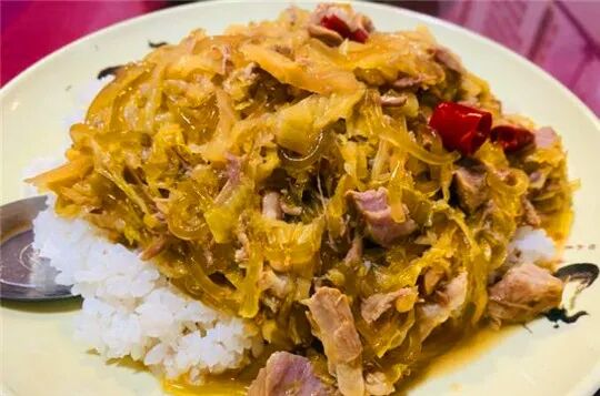 酸菜剔骨肉盖饭,东北的酸菜、粉条和剔骨肉一起炒,菜多肉烂一大盘子,就是一个造~