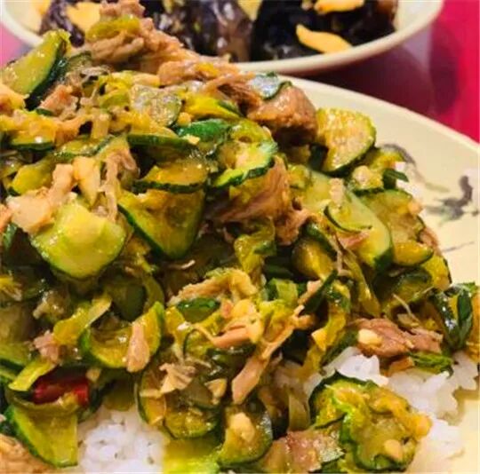 黄瓜剔骨肉盖饭,能吃出黄瓜的清甜和青椒的辣意,也是特别下饭的。