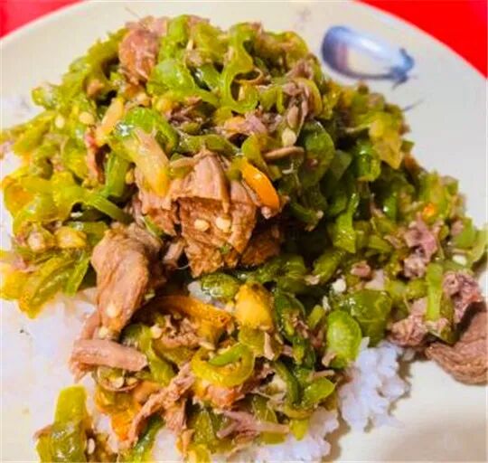 尖椒剔骨肉盖饭,吃的人最多,饭多剔骨肉多,青椒也多。香香辣辣的特别下饭。