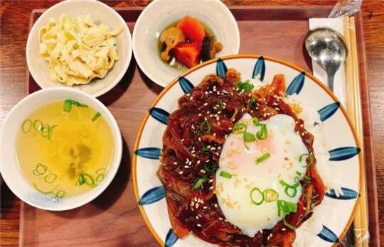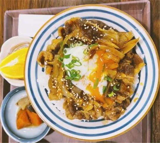 温泉蛋牛肉饭,肥牛够新鲜够嫩,配合温泉蛋的蛋液拌饭,口感旖旎。