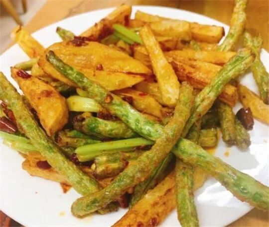 干煸芸豆土豆,土豆、豆角炸得酥酥的,土豆炸得像薯条。
