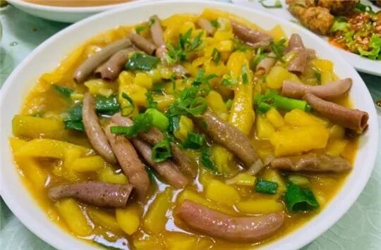 还有土豆条炒海肠,土豆非常香,海肠火候刚刚好。杂拌鱼汤,传统老味道。基本每道菜里都有海鲜。真的是家不错的吃海鲜的小店!适合去喝点小酒哈。