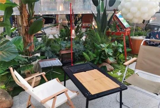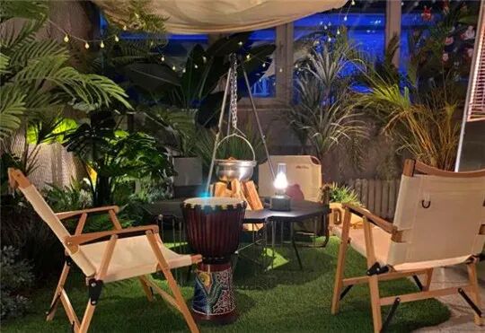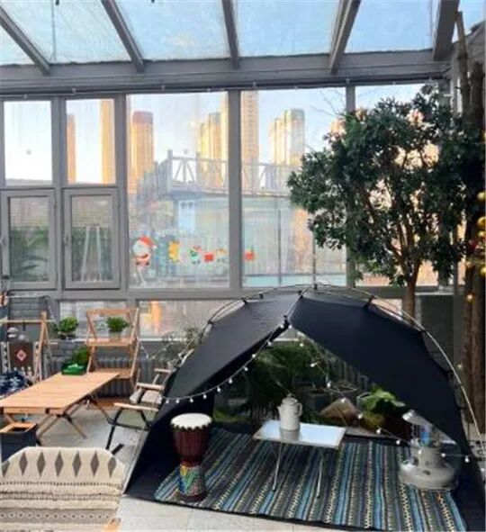 在这里能体验到露营乐趣,通透的玻璃房内到处是户外元素,颇具氛围感的躺椅和露营餐具摆在周围,帐篷、天幕、户外折叠椅,野营风格拿捏得死死的,真真的自然休闲放松心情~