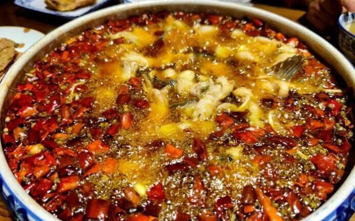 红汤水煮鱼,滚烫的热油还在咕嘟咕嘟冒泡,瞬间各种复合香气腾空而起,一道水煮鱼就这么热气腾腾地出现在眼前。要说他家独特,还得是鱼肉表明这层薄薄的椒盐粉,吃到嘴里,除了花椒干辣椒的冲击,后续依旧满口椒盐酥香。弄个水煮鱼,再安排些妥川菜及小菜,妥妥的~