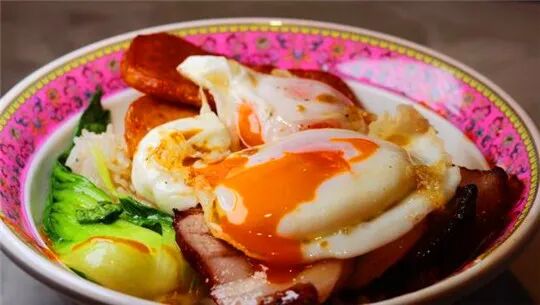 叉烧饭的酱汁给得很痛快,米饭经过充分的浸润,口感有点偏软,把两颗颤巍巍的溏心蛋拌进饭里会更香甜。