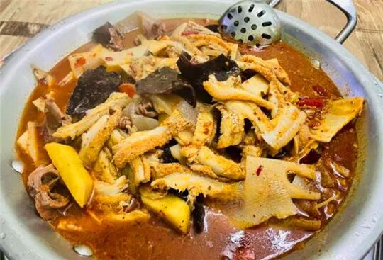 就是那种川渝小店的感觉,有5张桌子,菜单挂在墙上,泡椒火锅为主打招牌,分量分大中小,不同规格价格也不同。黄豆芽打底,泡椒牛肚、泡椒肥肠、泡椒凤爪······