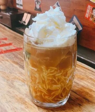 不良少年啤酒拉面里,真木有啤酒,看起来像啤酒的汤汁,装在喝扎啤的杯子里。啤酒花则是用细腻的蛋清打发而成的,是不是很有趣!