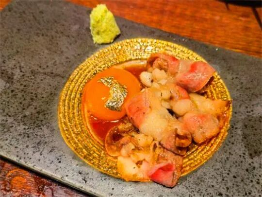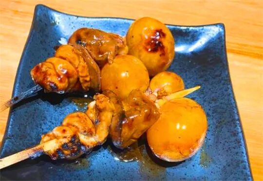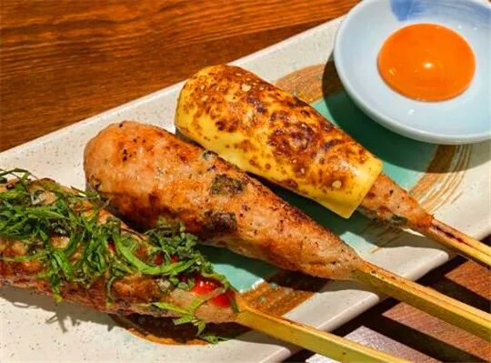 鸡提灯,这是烧鸟中最火最热门的一个部位,量少,不一定都能吃到。烤的不至全熟,入口轻轻一磕,薄薄一层胞衣就裂了口儿,流心鸡蛋黄喷薄而出,在口中化作一腔温柔浓厚。