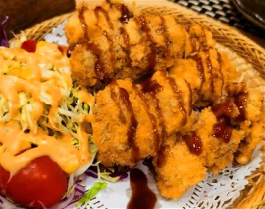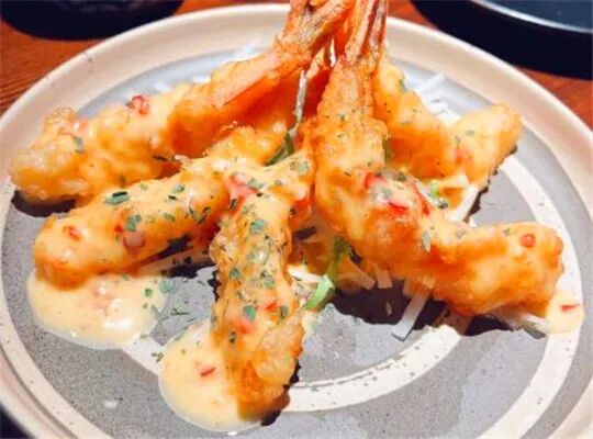 美乃滋炸虾,裹着面粉和鸡蛋的虾球炸软后厚厚地裹上一层美乃滋酱,酸甜可口,超好吃。
