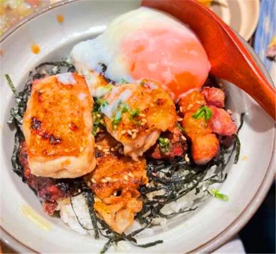 日式鸡肉串拌米饭,加上酱汁,挺好吃,里面除了鸡肉还有鸡胗跟鸡肝丰富口感。