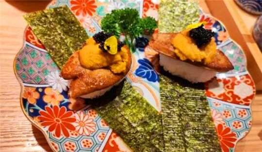 鹅肝海胆塔塔,一瓣海胆铺放在一块鹅肝上,下面垫一片海苔。