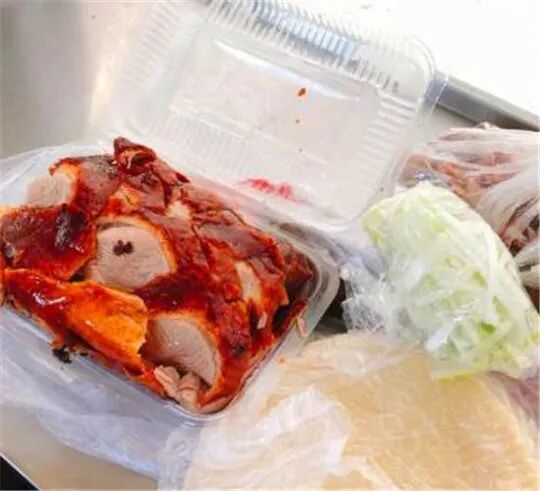 选用的是北京便宜坊的口味,做焖炉烤鸭,全身呈均匀的枣红色,油光润泽,味道浓郁。烤鸭现加工,体状丰满,出肉多,皮酥,内层嫩,一咬流油,入口即化。皮酥肉鲜嫩多汁,油滋滋的。