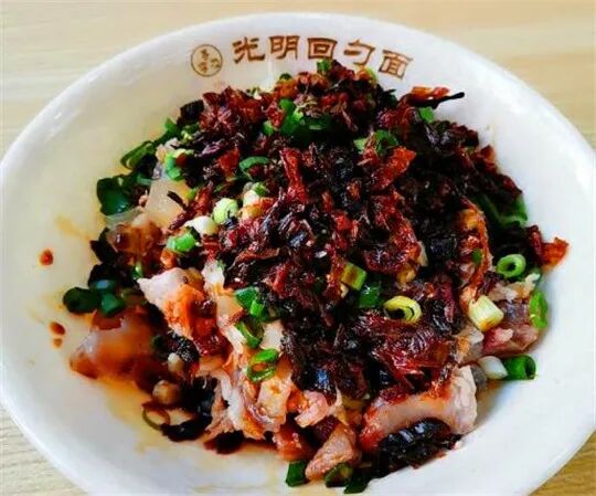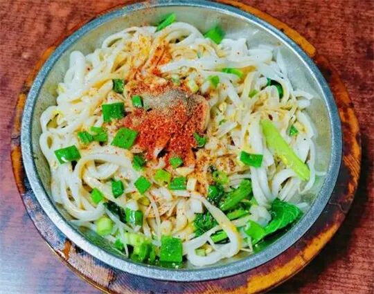 特色油泼面,油泼面超级彪悍,不是用小瓷碗装的,而是用大钢盆装着的,这面一上来就先勾起你的食欲,又粗又宽的面配上葱花、豆芽、小青菜,再撒上一层薄薄的辣椒面,红红绿绿的,面条很哏玖,吃起来很有嚼头,面软韧香的。