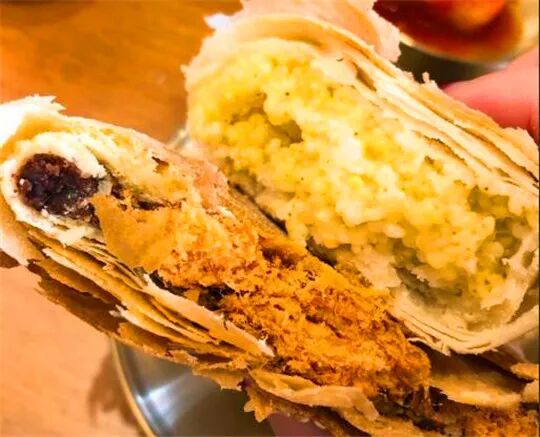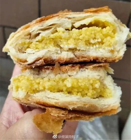 黄米软饼,还有一款黄米酥饼,里面都是黏黏糯糯的黄米没有加很多糖,就是淡淡的清香。酥饼的就是外皮软软酥酥的,火候刚好,很香。QQ饼,满满的肉松,还有红豆和麻薯陪衬,层层相叠。