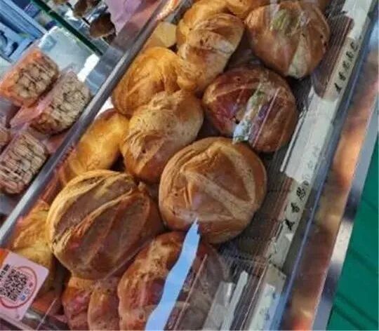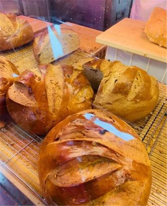 市场中最出名的就是全麦大列巴,有全麦无糖大列巴、全麦低糖大列巴。列巴外皮酥韧,里面绵软,麦香足,里面有花生仁、核桃仁、芝麻、瓜子、葡萄干。给切一块一块的,按斤称,8.8元/斤。