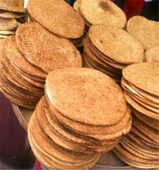 香酥青稞饼,表面撒满芝麻,芝麻烤得焦黄,掰开时能听见清脆的咔嚓声。口感酥脆,回味又有一种青稞特有的甘甜,越嚼越香。