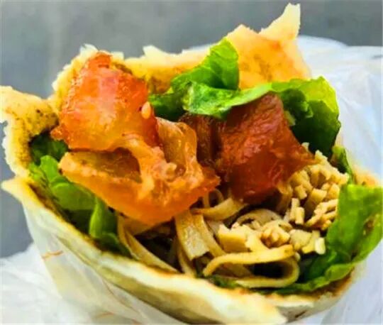 网红热门款的卤汁卷饼店,面饼包裹卤肉、烤鸭、 火腿、牛肉、牛肚、鸡柳等食材。卷饼虽现点现做,但出餐很快。面饼包裹肉肉和蔬菜,里面东西不少,看着就过瘾。