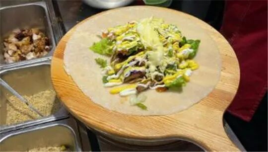 马苏里拉芝士烤肉卷饼,蔬菜、肉肉、芝士、洋葱、番茄...整整5重馅料,烤肉卷饼搭配的是可以拉丝的马苏里拉奶酪芝士,馥郁的芝士许给你满满的拉丝感。
