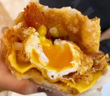 饼炸的又香又酥,这家炸的是鸡蛋,蛋一下锅就开了花,所以才叫大花,标配就是饼+蛋 ,卷上玉米、芝士、猪扒、洋葱。