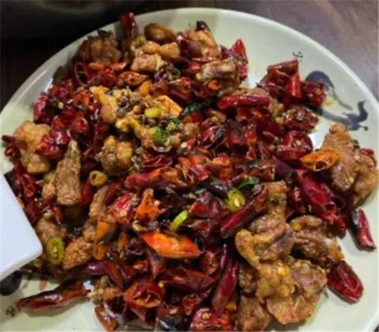 辣子鸡,味道火辣,鸡肉香韧有嚼劲,是很惹味的一道菜肴。
