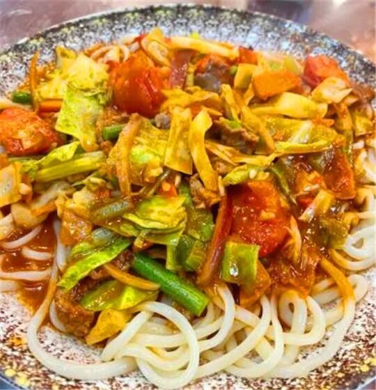 新疆拌面,面条特别筋道,各种蔬菜,当然必不可少的番茄太提味。
