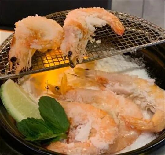 砂锅火焰盐焗虾,盐焗的做法保留了虾原本的鲜味。虾的表皮酥脆咸香十足。