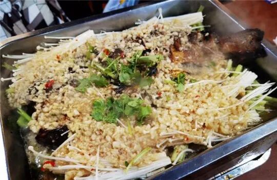 蒜香烤鱼,这炸得金黄的整颗蒜粒和青红椒洋葱等一同盖在烤鱼的上边,浓郁的蒜香不断散发出来。厚实的鱼肉连肉带皮整块夹起,沾满了汤汁实在是香。