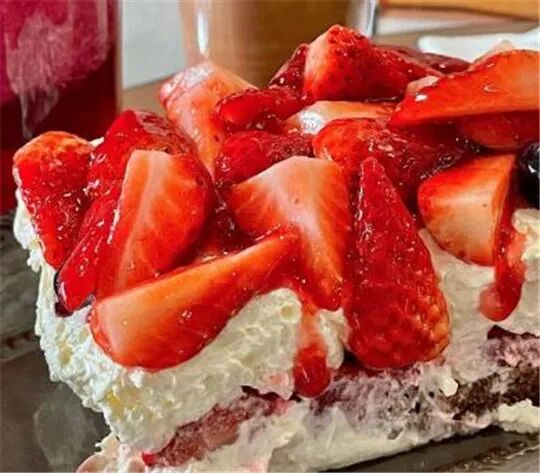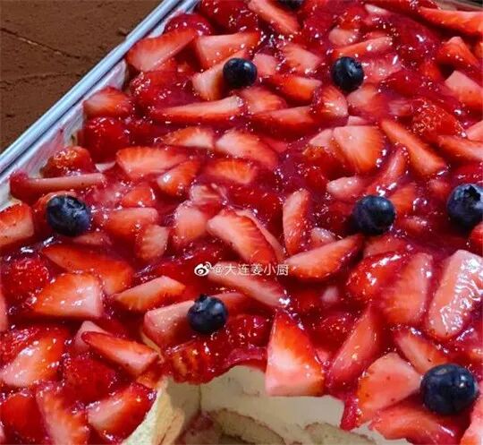 莓果提拉米苏,上面一层满满的新鲜的草莓,下面的奶油蛋糕胚中夹的也是草莓酱。