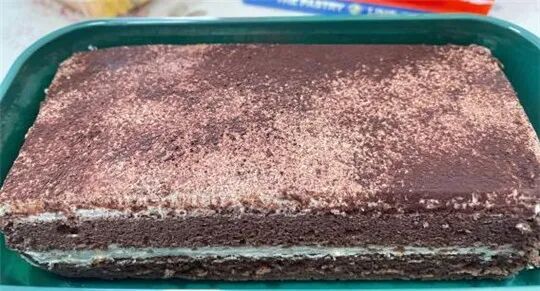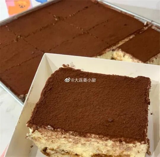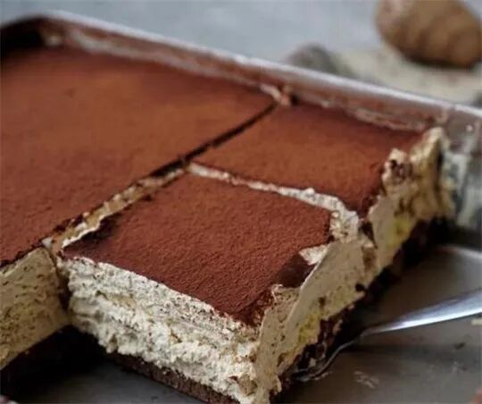 提拉米苏,招牌产品,一整版,被切成一块块的豆腐块状,奶油细腻,上面一层可可粉略带微微的苦。