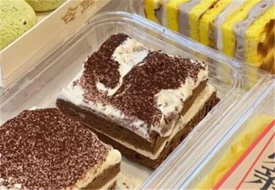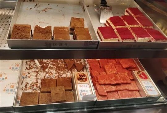提拉米苏、红丝绒慕斯,一块一块的摆放,都是按斤称,轻咬一口满嘴便是满满奶油香气。