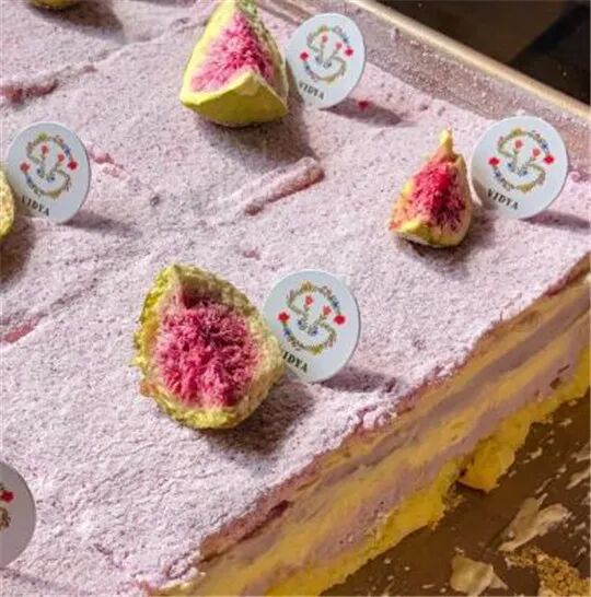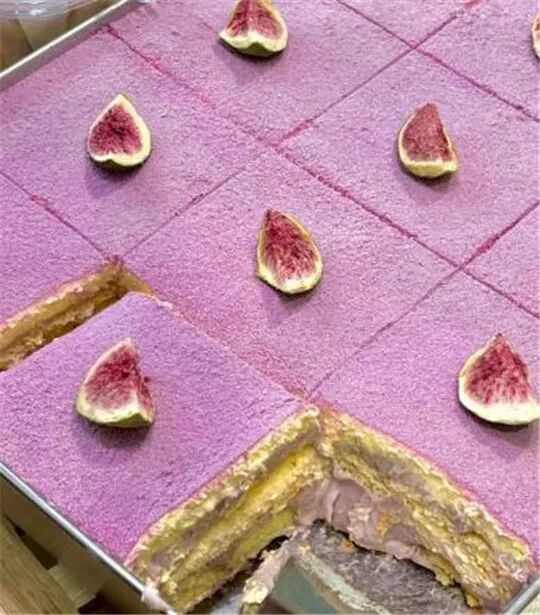 芋泥提拉米苏,颜色粉紫上面有一块冻干无花果,下面夹了厚厚芋泥。