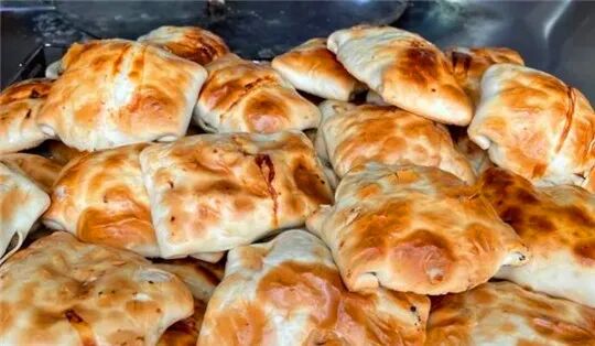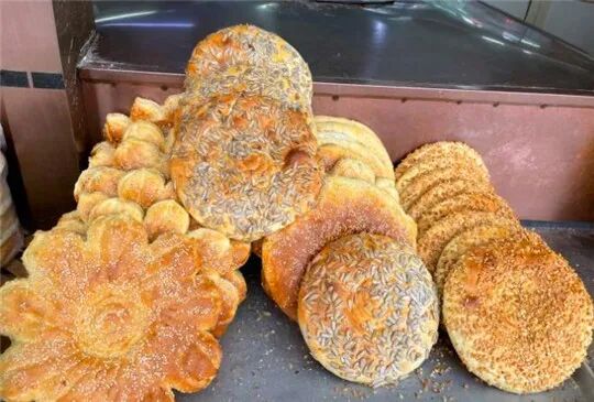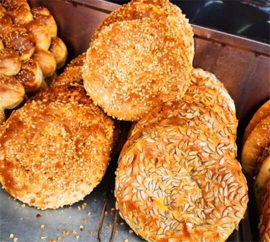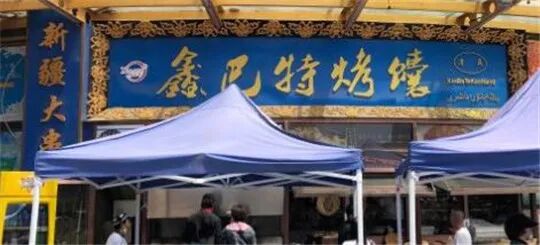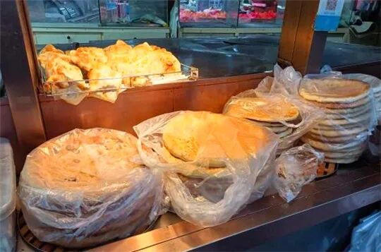 做新疆烤馕、烤包子以及羊肉大串。在市场里,看到遮阳帐篷,门口一堆人就是他家。馕都是现场现做,有干果的,原味的、孜然的。原味的馕,上面一层芝麻,中间薄脆,外围厚实有嚼劲,面香十足。